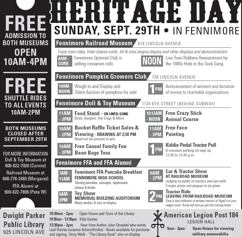 Free self-guided tour of the museum, bean bags, crazy animal stick course, face painting, kiddie peddle tractor pull. there will be a food stand on the grounds and a bucket raffle!! Also in town, the same day is the FFA breakfast, FFA toy show, Railroad grounds will have tractors, cars, hit and miss, and the pumpkin grower display/weigh-in. There will also be free wagon rides around to different stopping points. LOTS of FUN, can't wait to see you friends! … [Read more...]
